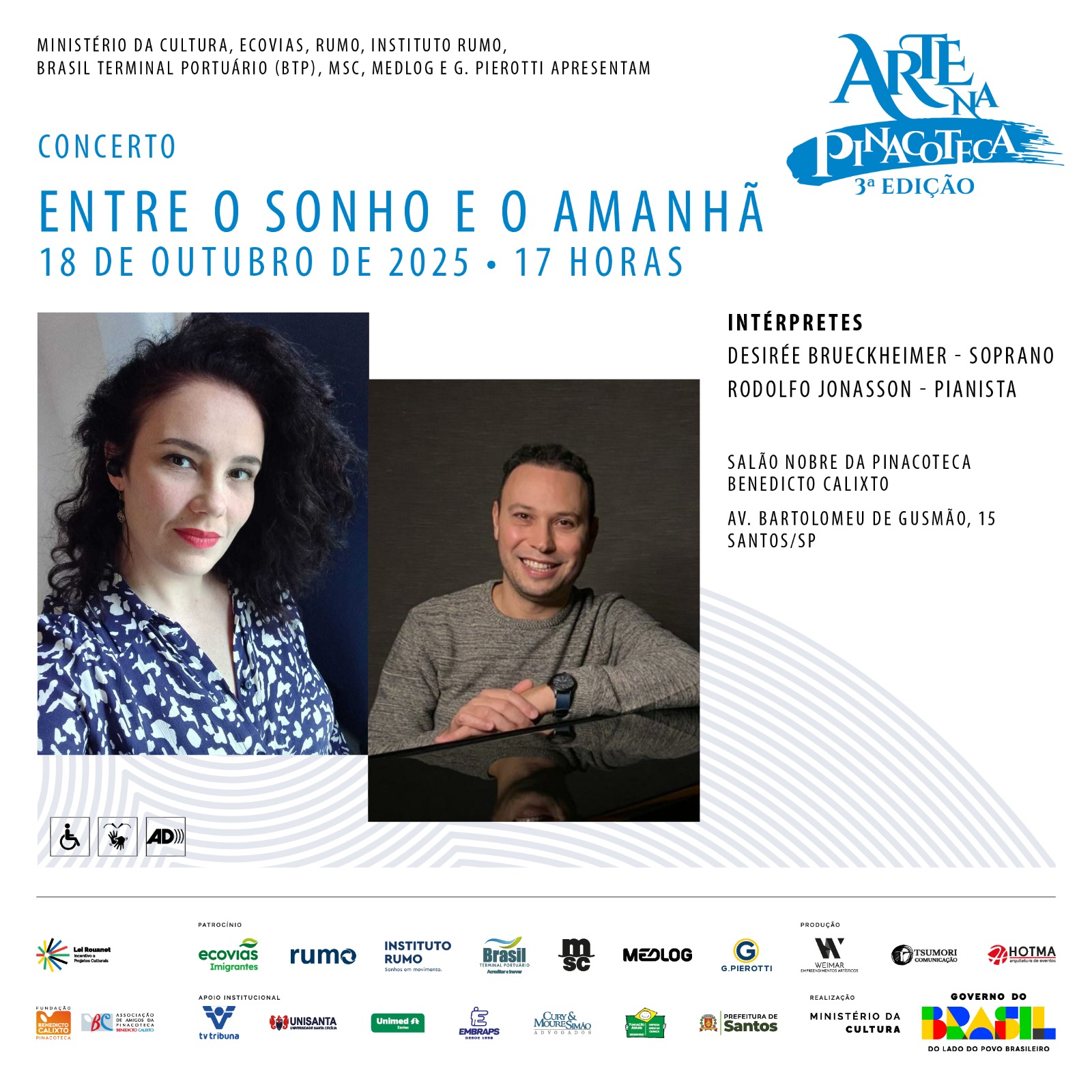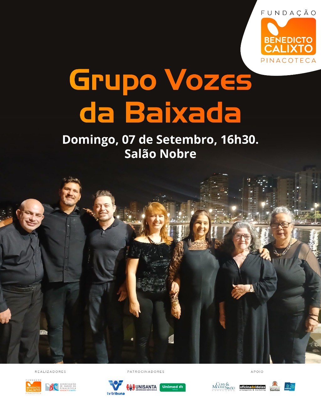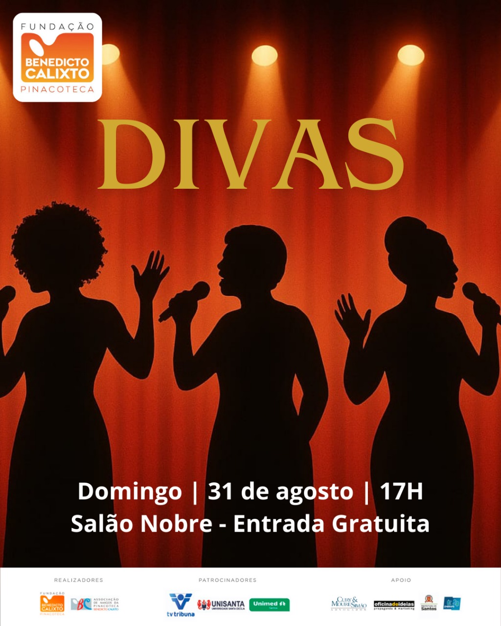 Ingresso gratuito, em cada dia de apresentação, a partir das 16h00, as apresentações também estarão disponíveis pelo canal do You Tube da Pinacoteca Benedicto Calixto. -
