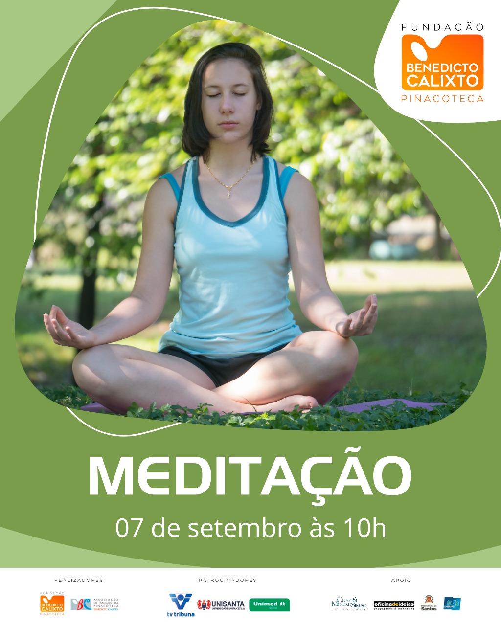 Meditação e Aromaterapia com Mara Piai. Nos Jardins da Pinacoteca. Traga sua água e sua toalha. Entrada gratuita mas se chover, o evento será cancelado.