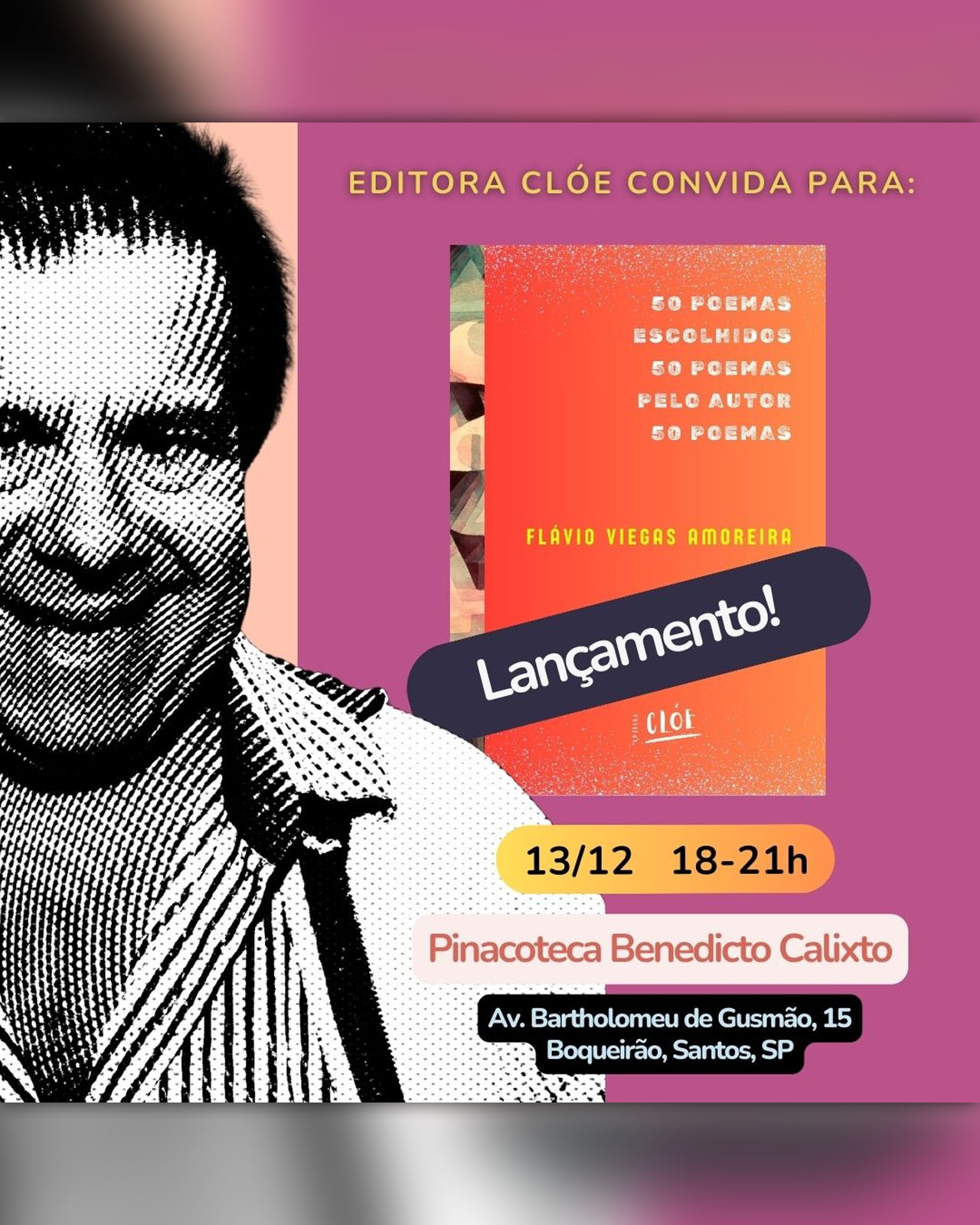 Quinta-Feira, 12 de Dezembro, 18h00 - Apresentação do CORAL CALIXTO, entrega do prêmio de fotografias e abertura da exposição CINCO ARTISTAS DE SANTOS com Érica Gropp, Luciana Futuro, Miriam Alvim, Sara Bittante e Suzi Carvalho.