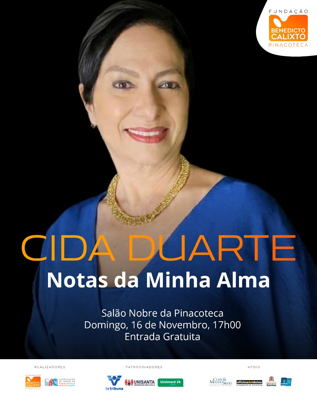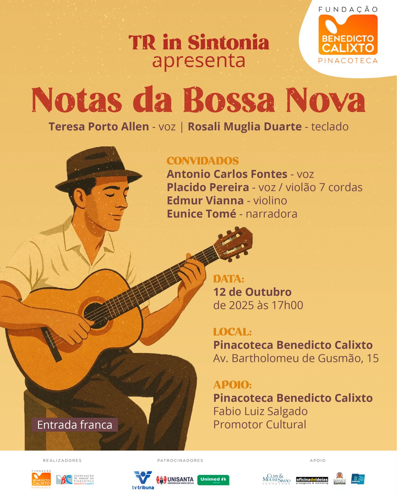 Ingresso gratuito, em cada dia de apresentação, a partir das 16h00, as apresentações também estarão disponíveis pelo canal do You Tube da Pinacoteca Benedicto Calixto. -