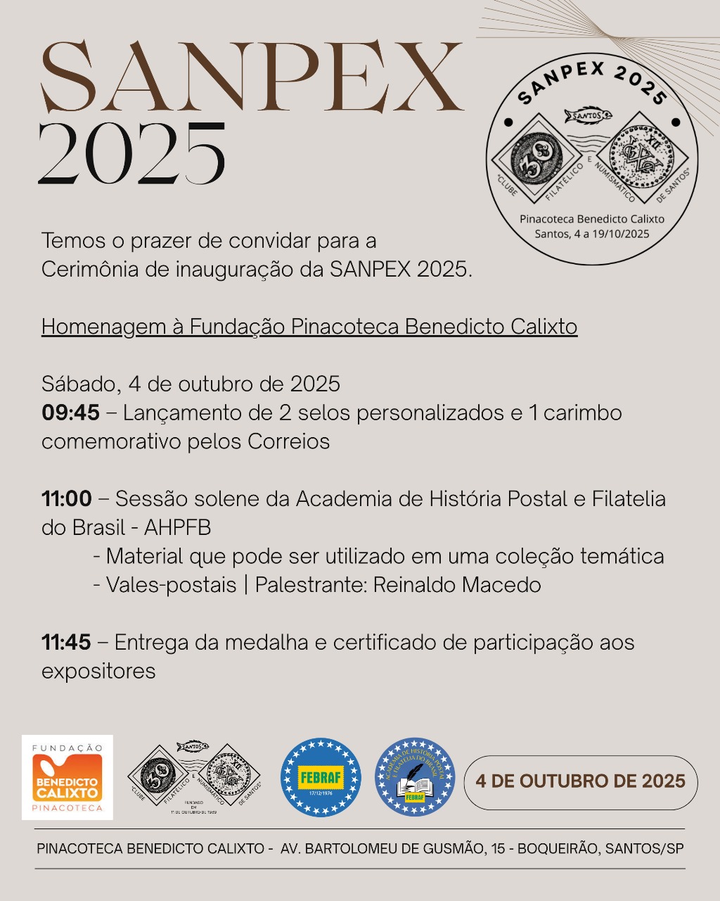 Sexta, 04 de Outubro, 20h, Salão Nobre da Pinacoteca Benedicto Calixto